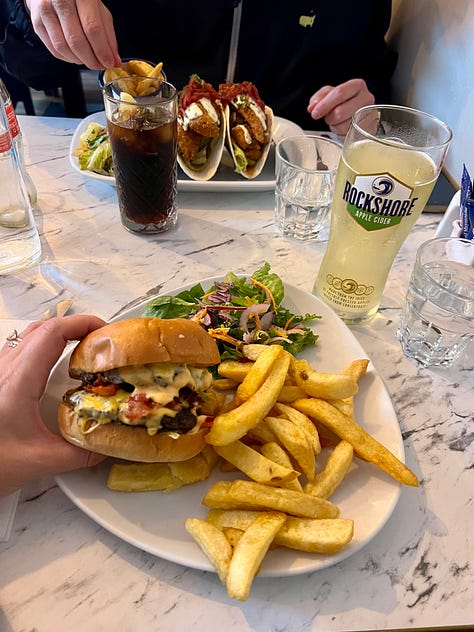 The Fish Box - Walk in only. You can put your name in and then go grab a pint somewhere while you wait for the text that your table is ready. I ordered the smashburger which was delicious, but a lil thicker than your average smashburger. Garret got the fish tacos. Hours change often so follow them on Instagram before you go. It is very worth it! (Beli rating: 8.1)