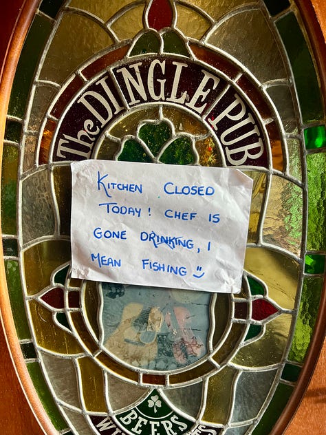 The Dingle Pub - This place is casual and fun and good for a quick pint. Loved the handwritten sign on the door that said “kitchen closed today! chef is gone