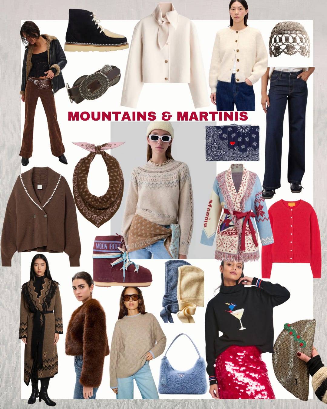 Clothes: Vegan Suede Pants (under $100!), Wool Blend Jacket (great price!), Fuzzy Shaker Stitch Cardigan (on sale!), Palazzo Jeans (softest jeans you can even wear on the plane, I promise!), Megeve Oversized Cardigan, Cloud Chalet Crew and Compass Jane Cardigan (15% off with code SPRINGKNITS), Totley Embroidered Rib Knit Cardigan, Sumaq Brown Coat, Gala Affair Faux Fur Jacket, Tess Cashmere Sweater, Apres Ski Martini Turtleneck (a must!)
